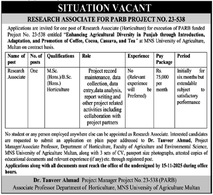 <h4> RESEARCH ASSOCIATE FOR PARB PROJECT NO.23-538 </h4><p>Research Associate, Horticulture, PARB Project, Agriculture, Punjab, Coffee, Cocoa, Cassava, Tea, Crop Diversity, Agricultural Research, Project Management, Data Collection, Data Analysis, Report Writing, Field Work, Laboratory Work, Crop Introduction, Crop Adaptation, Sustainable Agriculture, Plant Science, Agronomy, Horticultural Practices, Crop Promotion, Seedling Management, Plant Breeding, Soil Management, Pest Management, Irrigation, Fertilization, Plant Nutrition, Crop Monitoring, Agricultural Development, Environmental Science, University Research, MNS University, Multan, Contract Job, Project-Based Job, Six-Month Contract, Salary Rs. 75,000, Academic Job, Research Assistant, Scientific Research, Experimental Trials, Data Entry, Record Keeping, Research Collaboration, Teamwork, Project Support, Crop Trials, Crop Productivity, Agricultural Innovation, Field Surveys, Crop Evaluation, Agricultural Techniques, Farm Management, Crop Planning, Agroforestry, Plantation Projects, Crop Experiments, Research Reports, Horticultural Projects, Crop Introduction Strategies, Plant Adaptation, Crop Sustainability, Agricultural Diversity, Data Interpretation, Project Documentation, Performance-Based Extension, Career in Agriculture, Professional Development, Agriscience, Research Opportunity, Agricultural Studies, University Position, Academic Research, Applied Horticulture.</p><p><strong>MNS University of Agriculture, Multan</strong> is seeking a Research Associate (Horticulture) for PARB Project No. 23-538. The project focuses on enhancing agricultural diversity in Punjab by introducing and promoting coffee, cocoa, cassava, and tea. The role involves data collection, record keeping, analysis, report writing, and collaboration with project partners. This is a six-month contract position, extendable based on performance, offering a monthly salary of Rs. 75,000. Candidates must hold a degree in Horticulture and must not be enrolled as a student or employed elsewhere.</p><p>Applications are invited for one post of Research Associate (Horticulture) for execution of PARB funded Project No. 23-538 entitled "Enhancing Agricultural Diversity in Punjab through Introduction, Adaptation, and Promotion of Coffee, Cocoa, Cassava, and Tea" at MNS University of Agriculture, Multan on contract basis.</p><h4><strong>Position:</strong></h4><figure class="table"><table><thead><tr><th>Name of Post</th><th>No. of Posts</th><th>Qualifications</th><th>Role & Responsibilities</th><th>Experience</th><th>Pay Package</th><th>Period</th></tr></thead><tbody><tr><td>Research Associate (Horticulture)</td><td>1</td><td>M.Sc. (Hons.) / B.Sc. (Hons.) Horticulture</td><td>Project record maintenance, data collection, data entry, data analysis, report writing, collaboration with project partners</td><td>Not required (Relevant experience preferred)</td><td>Rs. 75,000/month</td><td> </td></tr></tbody></table></figure><p> </p><p><strong>Role & Responsibilities:</strong></p><p>Maintain project records</p><p>Collect and enter data</p><p>Analyze data and prepare reports</p><p>Support project activities and collaborate with project partners</p><p><strong>Experience:</strong></p><p>No prior experience required</p><p>Relevant experience preferred</p><p><strong>Pay:</strong></p><p>Rs. 75,000 per month</p><p><strong>Contract Duration:</strong></p><p>Initially six months, extendable based on performance</p><p><strong>Eligibility:</strong></p><p>Candidates must not be enrolled as a student or employed elsewhere</p><p><strong>Application Process:</strong></p><p>Submit a handwritten application on plain paper addressed to:<br><strong>Dr. Tanveer Ahmad</strong><br>Project Manager / Associate Professor<br>Department of Horticulture, Faculty of Agriculture and Environmental Science<br>MNS University of Agriculture, Multan</p><p>Include:</p><p>3 sets of CV</p><p>Passport size photographs</p><p>Attested copies of educational documents</p><p>Proof of relevant experience (if any)</p><p>Submit via <strong>registered post</strong>.</p><p><strong>Deadline:</strong></p><p>Applications must reach by <strong>15-11-2025</strong> during office hours</p><p><strong>Contact:</strong><br>Dr. Tanveer Ahmad<br>Project Manager, PARB Project No. 23-538<br>Associate Professor, Department of Horticulture<br>MNS University of Agriculture, Multan</p><p><strong>FAQs: Research Associate (Horticulture) – PARB Project No. 23-538</strong></p><p><strong>Q. What is the position?</strong><br>A. Research Associate (Horticulture) for a PARB-funded project.</p><p><strong>Q. How many vacancies are available?</strong><br>A. One position is open.</p><p><strong>Q. What are the eligibility criteria?</strong><br>A. Candidates must have M.Sc. (Hons.) or B.Sc. (Hons.) in Horticulture and must not be enrolled as a student or employed elsewhere.</p><p><strong>Q. Is prior experience required?</strong><br>A. No prior experience is required, but relevant experience will be preferred.</p><p><strong>Q. What will the role involve?</strong><br>A. Maintaining project records, collecting and entering data, analyzing data, writing reports, and collaborating with project partners.</p><p><strong>Q. What is the salary?</strong><br>A. Rs. 75,000 per month.</p><p><strong>Q. What is the contract duration?</strong><br>A. Initially six months, extendable based on performance.</p><p><strong>Q. How can I apply?</strong><br>A. Submit a handwritten application on plain paper addressed to Dr. Tanveer Ahmad, along with 3 sets of CV, passport-size photos, attested educational documents, and relevant experience certificates (if any) via registered post.</p><p><strong>Q. What is the application deadline?</strong><br>A. Applications must reach the office by 15-11-2025 during office hours.</p><p><strong>Q. Who can I contact for more information?</strong><br>A. Dr. Tanveer Ahmad, Project Manager / Associate Professor, Department of Horticulture, MNS University of