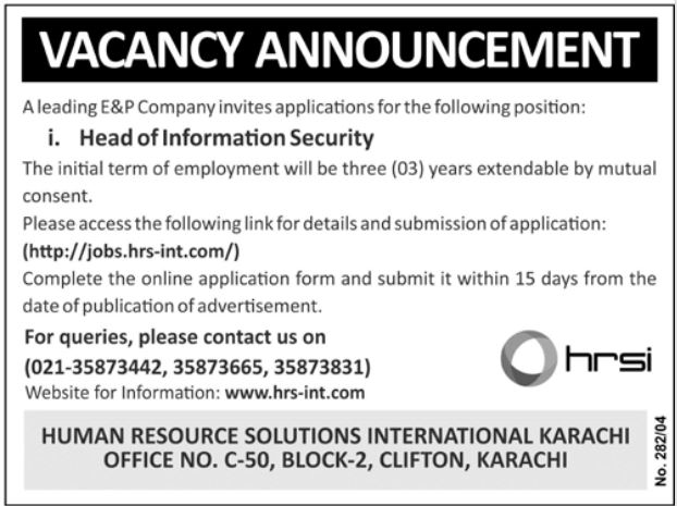 <h4><strong>Human Resource Solutions International Karachi</strong></h4><p>Head of Information Security, Cybersecurity Leadership, E&P Industry Security, Information Security Management, Data Protection, Risk Assessment, Security Frameworks, IT Governance, Strategic Security Planning, Cyber Risk Mitigation, Compliance and Regulations, Security Policies, Threat Detection, Karachi Jobs, Senior Leadership Role, Contract Employment, Professional Experience Required, Technology Risk Management, Critical Infrastructure Security, Cybersecurity Best Practices</p><p>Human Resource Solutions International Karachi is inviting applications for a senior leadership role in a leading E&P company. The company is looking for an experienced professional to lead its Information Security function, ensuring robust protection of critical data and systems. This is a strategic position with an initial three-year contract, offering the opportunity to shape the company’s security framework and drive best practices in cybersecurity.</p><p>A leading E&P company is seeking applications for the position of Head of Information Security.</p><p><strong>Term of Employment:</strong> Initial contract of three years, extendable by mutual agreement.</p><p><strong>How to Apply:</strong> Complete the online application form at <a href="http://jobs.hrs-int.com/">http://jobs.hrs-int.com/</a> within 15 days of this advertisement.</p><p><strong>For Inquiries:</strong> Call 021-35873442, 35873665, or 35873831.</p><p><strong>More Information:</strong> Visit <a href="http://www.hrs-int.com">www.hrs-int.com</a></p><p><strong>Office Address:</strong> Human Resource Solutions International, Office No. C-50, Block-2, Clifton, Karachi.<br><strong>Reference:</strong> No. 282/04</p><h4><strong>FAQs – Head of Information Security Position</strong></h4><p><strong>1. What is the duration of the employment contract?</strong><br>The initial term is three years and may be extended by mutual agreement.</p><p><strong>2. How can I apply for this position?</strong><br>Submit your application online through <a href="http://jobs.hrs-int.com/">http://jobs.hrs-int.com/</a> within 15 days of the advertisement.</p><p><strong>3. What qualifications or experience are required?</strong><br>Candidates should have extensive experience in information security management, leadership skills, and knowledge of cybersecurity frameworks relevant to E&P operations.</p><p><strong>4. Where is the office located?</strong><br>The Karachi office is at C-50, Block-2, Clifton, Karachi.</p><p><strong>5. Who can I contact for more information or queries?</strong><br>Call 021-35873442, 35873665, or 35873831, or visit <a href="http://www.hrs-int.com">www.hrs-int.com</a> for more details.</p><p><strong>6. Is this position permanent?</strong><br>The role starts with a three-year contract, extendable based on mutual consent.</p><p><strong>7. Can I submit my application after the 15-day deadline?</strong><br>Applications received after the deadline will not be considered.</p><p><strong>8. What is the main responsibility of this role?</strong><br>Leading the company’s information security strategy, protecting critical systems, and ensuring compliance with industry standards.</p><p> </p>