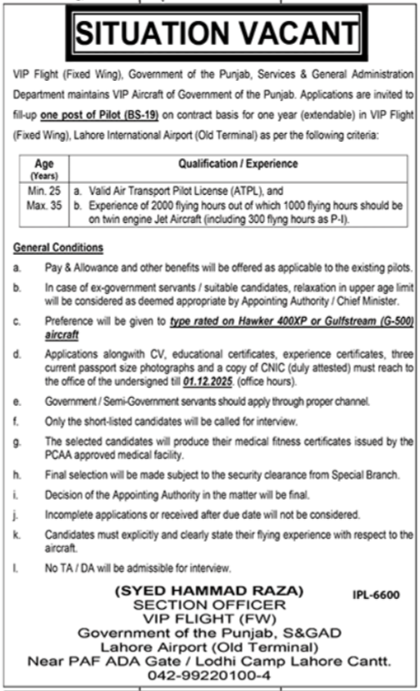 <h4><strong>Job Opportunity: Pilot (BS-19) – VIP Flight, Government of the Punjab</strong></h4><p>Pilot vacancy, VIP Flight, Fixed Wing, Government of Punjab, Lahore Airport, ATPL, Air Transport Pilot License, Twin-engine jet experience, Hawker 400XP, Gulfstream G-500, Flying hours requirement, Contract job, BS-19, Aviation career, Pilot recruitment, PCAA medical fitness, Security clearance, Experienced pilots, Age limit 25-35, Pilot job Pakistan, Government pilot position.</p><p>VIP Flight (Fixed Wing), under the Services & General Administration Department, maintains VIP aircraft for the Government of the Punjab. Applications are invited for one post of Pilot (BS-19) on a one-year contract, extendable, based at Lahore International Airport (Old Terminal).</p><figure class="table"><table><thead><tr><th>Post Title</th><th>BPS</th><th>No. of Posts</th><th>Age Limit</th><th>Qualification / Experience</th></tr></thead><tbody><tr><td>Pilot (VIP Flight, Fixed Wing)</td><td>19</td><td>1</td><td>25–35 years</td><td>Valid ATPL, 2000 flying hours (1000 on twin-engine jet, 300 as P-1), preference for Hawker 400XP or Gulfstream G-500</td></tr></tbody></table></figure><h4><strong>Eligibility Criteria:</strong></h4><p><strong>Age:</strong> 25 to 35 years (relaxation may be considered for ex-government servants or exceptional candidates)</p><p><strong>Qualifications & Experience:</strong></p><p>Valid Air Transport Pilot License (ATPL)</p><p>Minimum 2000 flying hours, including 1000 hours on twin-engine jet aircraft (at least 300 hours as P-1)</p><p>Preference for candidates type-rated on Hawker 400XP or Gulfstream G-500</p><h4><strong>General Conditions:</strong></h4><p>Salary, allowances, and other benefits as per existing pilot scales</p><p>Applications must include: CV, educational and experience certificates, three recent passport-size photos, and a CNIC copy (all attested)</p><p>Government or semi-government employees must apply through proper channels</p><p>Only shortlisted candidates will be called for interview</p><p>Selected candidates must provide a medical fitness certificate from a PCAA-approved facility</p><p>Final selection is subject to security clearance from the Special Branch</p><p>Flying experience must be clearly detailed in the application</p><p>No TA/DA will be provided for the interview</p><p>Incomplete or late applications will not be considered</p><p><strong>Application Deadline:</strong> 01 December 2025 (during office hours)</p><p><strong>Submit Applications To:</strong><br>Syed Hammad Raza, Section Officer VIP Flight (FW)<br>Government of the Punjab, S&GAD<br>Lahore Airport (Old Terminal), Near PAF ADA Gate / Lodhi Camp, Lahore Cantt<br>Phone: 042-99220100-4</p><h4><strong>FAQs – Pilot (VIP Flight, Fixed Wing), Government of the Punjab</strong></h4><p><strong>Q1: Who can apply for this pilot position?</strong><br>A1: Candidates aged 25–35 with a valid Air Transport Pilot License (ATPL) and 2000 flying hours, including 1000 hours on twin-engine jet aircraft, can apply. Preference is given to pilots type-rated on Hawker 400XP or Gulfstream G-500.</p><p><strong>Q2: Can ex-government employees apply?</strong><br>A2: Yes, relaxation in the upper age limit may be considered for ex-government servants or highly experienced candidates.</p><p><strong>Q3: What documents are required with the application?</strong><br>A3: Submit CV, educational certificates, experience certificates, three recent passport-size photos, and a copy of CNIC, all attested. Government employees must apply through proper channels.</p><p><strong>Q4: Will all applicants be called for an interview?</strong><br>A4: No, only shortlisted candidates will be contacted for interviews.</p><p><strong>Q5: Is a medical certificate required?</strong><br>A5: Yes, selected candidates must provide a medical fitness certificate from a PCAA-approved facility.</p><p><strong>Q6: Is flying experience on specific aircraft necessary?</strong><br>A6: Candidates must clearly state their flying experience and type of aircraft in the application. Preference is given to pilots type-rated on Hawker 400XP or Gulfstream G-500.</p><p><strong>Q7: Are TA/DA provided for the interview?</strong><br>A7: No travel allowance or daily allowance will be provided.</p><p><strong>Q8: Is the selection final?</strong><br>A8: Final selection is subject to security clearance from the Special Branch, and the decision of the Appointing Authority is final.</p>