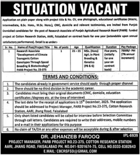 <h4><strong>SITUATION VACANT</strong> </h4><p>Application en plain paper along with project title & No. CV, one photograph, educational certificates (Matric, Intermediate, B.Sc. Hons, M.Sc. Hons.), CNIC, domicile and relevant testimonies, are Invited from Punjab Domiclled candidates for the post of Research Associate of Punjab Agricultural Research Board (PARS) funded project at Cotton Research Station, AARI, Felsalabad on contract basis for one year (extendable upon annual satisfactory performance).</p><h4><strong>Position:</strong></h4><figure class="table"><table><thead><tr><th>Sr. No</th><th>Post / Project Title</th><th>No. of Posts</th><th>Age</th><th>Qualification</th><th>Duration</th><th>Pay Package</th><th>Location</th><th> </th><th> </th></tr></thead><tbody><tr><td>1</td><td>Research Associate – "Development of Climate Transgenic Cotton Genotypes Through Speed Breeding & Biotechnology" (PARS Project No. 23-375)</td><td>1</td><td>21-35</td><td>MSc (Hons) Agriculture in Plant Breeding & Genetics</td><td>1 year (extendable up to 5 years based on performance)</td><td>PKR 75,000/month (7% annual increment)</td><td>Cotton Research Station, AARI, Jhang Road, Faisalabad</td><td> </td><td> </td></tr></tbody></table></figure><h4><strong>Terms & Conditions</strong></h4><p>Government employees must apply through proper channel.</p><p>No third division in academic records.</p><p>Original documents (CNIC, domicile, educational certificates) required at interview.</p><p>Only shortlisted candidates will be called for interview via call letters; include address, mobile number, and email in the application.</p><p>No TA/DA will be provided.</p><h4><strong>Application Address</strong></h4><p><br>Project Manager, PARB Project No. 23-375, Cotton Research Station, AARI, Jhang Road, Faisalabad</p><h4><strong>Contact</strong></h4><p>Phone: 041-9201674-75<br>Cell: 0333-8382643<br>Email: <a href="mailto:CBCRSFSD@GMAIL.COM">CBCRSFSD@GMAIL.COM</a></p><h4><strong>FAQs – Research Associate, PARB Cotton Research Project</strong></h4><p><strong>Who can apply?</strong><br>Candidates must be Punjab domiciled, hold an MSc (Hons) in Agriculture specializing in Plant Breeding & Genetics, and be aged 21-35. Government employees should apply through proper channel.</p><p><strong>How many positions are available?</strong><br>Only one Research Associate position is available for this project.</p><p><strong>What is the duration and pay?</strong><br>Initial contract is for 1 year, extendable up to 5 years based on performance. Salary is PKR 75,000 per month with a 7% annual increment.</p><p><strong>What documents are required?</strong><br>Applications must include CV, one photograph, educational certificates (Matric to MSc), CNIC, domicile, project title, and relevant testimonials. Original documents must be presented at the interview.</p><p><strong>Where and how should I submit my application?</strong><br>Applications should be sent to Project Manager, PARB Project No. 23-375, Cotton Research Station, AARI, Jhang Road, Faisalabad. Include your address, mobile number, and email. Last date is 15th December 2025.</p><p><strong>Will TA/DA be provided for the interview?</strong><br>No travel or daily allowance will be provided during or after the selection process.</p><p><strong>How will candidates be selected?</strong><br>Only shortlisted candidates will be called for interview before the Selection Committee via call letters.</p><p><strong>Who can I contact for more information?</strong><br>Dr. Jehanzeb Farooq, Project Manager<br>Phone: 041-9201674-75<br>Cell: 0333-8382643<br>Email: <a href="mailto:CBCRSFSD@GMAIL.COM">CBCRSFSD@GMAIL.COM</a><strong>Location:</strong> Cotton Research Station, AARI, Jhang Road, Faisalabad</p><p><br><strong>Posted Date:</strong> 3rd December 2025<br><strong>Last Date to Apply:</strong> 15th December 2025<br><strong>Contract / Permanent:</strong> Contract (initially 1 year, extendable up to 5 years based on performance)</p><p> </p>