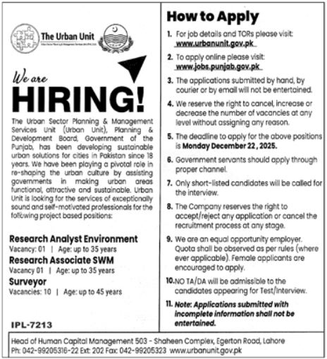 <h4><strong>Urban Unit is Hiring</strong></h4><p>The Urban Sector Planning & Management Services Unit (Urban Unit), under the Planning & Development Board, Government of the Punjab, has been shaping sustainable urban solutions in Pakistan for 18 years. We help governments make cities functional, attractive, and sustainable. We are looking for skilled and motivated professionals for the following project-based roles:</p><h4><strong>Available Positions:</strong></h4><p> </p><h4><strong>Research Analyst (Environment)</strong> – 1 vacancy, age up to 35 years</h4><p> </p><h4><strong>Research Associate (SWM)</strong> – 1 vacancy, age up to 35 years</h4><p> </p><h4><strong>Surveyor</strong> – 10 vacancies, age up to 45 years</h4><p> </p><h4><strong>How to Apply:</strong></h4><p>Review job details and TORs at <a href="http://www.urbanunit.gov.pk">www.urbanunit.gov.pk</a></p><p>Apply online at <a href="http://www.jobs.punjab.gov.pk">www.jobs.punjab.gov.pk</a></p><p>Applications sent by hand, courier, or email will not be accepted</p><p>Vacancies may be increased, decreased, or canceled without notice</p><p>Apply by <strong>Monday, December 22, 2025</strong></p><p>Government employees must apply through proper channels</p><p>Only shortlisted candidates will be contacted for interviews</p><p>The organization may accept or reject applications at any stage</p><p>We follow equal opportunity policies and quotas; female candidates are encouraged to apply</p><p>No TA/DA will be provided for tests or interviews</p><p>Incomplete applications will not be considered</p><h4><strong>Contact:</strong></h4><p>Head of Human Capital Management<br>503-Shaheen Complex, Egerton Road, Lahore<br>Ph: 042-99205316-22 Ext: 202 | Fax: 042-99205323<br><a href="http://www.urbanunit.gov.pk">www.urbanunit.gov.pk</a></p><h4><strong>FAQs</strong></h4><p><strong>1. Who can apply for these positions?</strong><br>Professionals meeting the age and qualification requirements listed for each role. Government employees must apply through proper channels.</p><p><strong>2. How can I apply?</strong><br>Apply online only at <a href="http://www.jobs.punjab.gov.pk">www.jobs.punjab.gov.pk</a>. Do not submit applications by hand, courier, or email.</p><p><strong>3. What is the application deadline?</strong><br>All applications must be submitted by Monday, December 22, 2025.</p><p><strong>4. Will all applicants be called for interviews?</strong><br>No, only shortlisted candidates will be contacted for interviews.</p><p><strong>5. Is there any travel allowance for interviews?</strong><br>No TA/DA will be provided to candidates appearing for tests or interviews.</p><p><strong>6. Can the number of vacancies change?</strong><br>Yes, the organization may increase, decrease, or cancel vacancies at any stage without prior notice.</p><p><strong>7. Are female candidates encouraged to apply?</strong><br>Yes, the Urban Unit is an equal opportunity employer and encourages female applicants.</p><p><strong>8. Will incomplete applications be considered?</strong><br>No, applications submitted with incomplete information will not be entertained.</p>