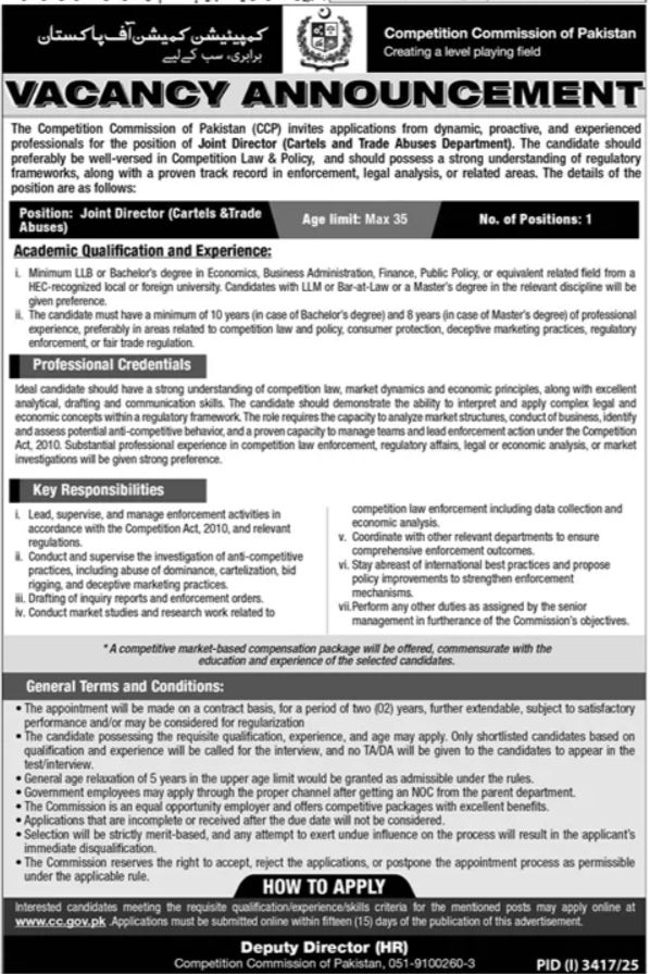 Competition Commission of Pakistan, CCP, Joint Director, Cartels, Trade Abuses, Competition Act 2010, anti-competitive practices, abuse of dominance, bid rigging, deceptive marketing, market regulation, enforcement, investigation, regulatory compliance, consumer protection, fair trade, economic analysis, legal drafting, market dynamics, competition law, policy implementation, compliance management, team leadership, strategic planning, report drafting, inquiry reports, enforcement orders, market studies, data analysis, policy development, regulatory affairs, case management, market monitoring, corporate law, antitrust, legal expertise, economic principles, corporate compliance, senior management, decision-making, public policy, finance, business administration, economics, LLB, LLM, Bar-at-Law, master’s degree, Islamabad jobs, government jobs Pakistan, merit-based selection, investigation leadership, regulatory enforcement, professional growth, Pakistan government careers.