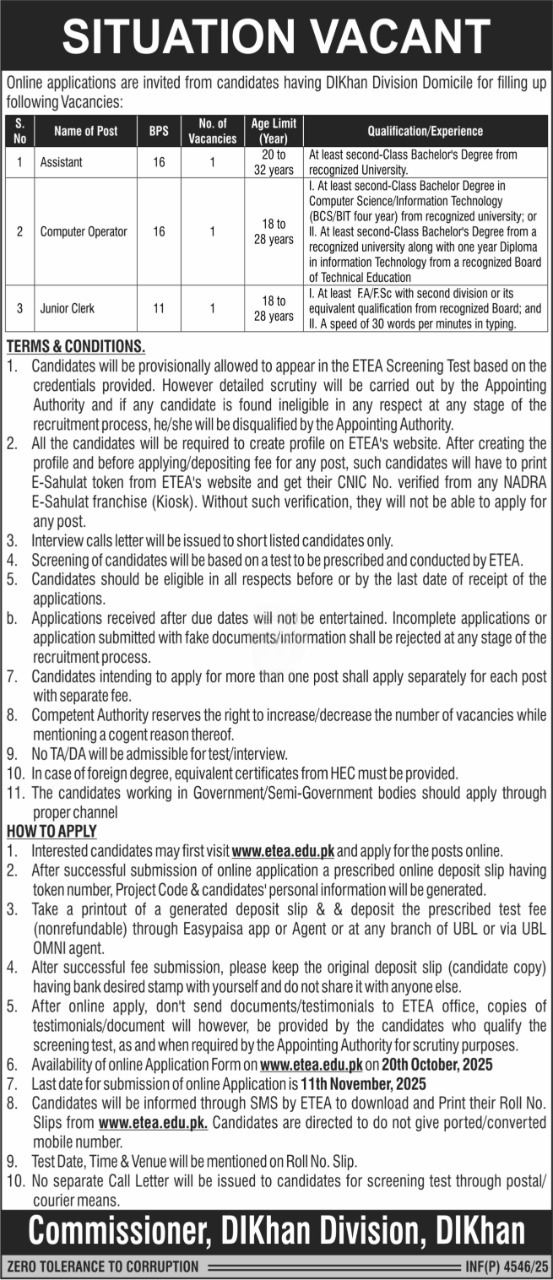 DIKhan Division, government jobs, Pakistan jobs, Assistant BPS-16, Computer Operator BPS-16, Junior Clerk BPS-11, online application, ETEA, screening test, merit-based selection, government vacancies, DIKhan domicile, age limit, qualifications, experience required, BCS, BIT, IT Diploma, EA, F.Sc, typing speed, CNIC verification, NADRA E-Sahulat, deposit slip, test fee, UBL, Easypaisa, UBL OMNI, Roll No. Slip, interview call, document verification, HEC equivalency, merit, transparency, zero corruption, government recruitment, semi-government, proper channel, last date, 11th November 2025, online apply, education board, recognized university, diploma in IT, typing 30 wpm, provisional selection, ineligible candidates, multiple applications, separate fee, application form, vacant positions, Commissioner DIKhan, official notification, job portal, test date, test venue, SMS notification, online profile, eligibility criteria, government employment, career opportunity 2025, online recruitment, application process, government exam, job alert, public sector jobs, office building, digital application, recruitment notice.