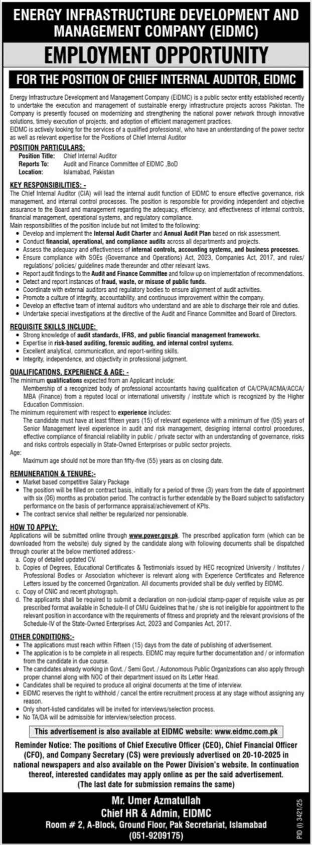 The position of Chief Internal Auditor (CIA) at EIDMC focuses on strengthening governance, accountability, and financial integrity within the organization. The role involves leading the internal audit function, ensuring risk management, compliance, and adherence to corporate governance standards. The CIA will develop and implement audit plans, assess internal controls, and ensure compliance with the Companies Act 2017 and SOEs Act 2023. Key areas include financial control, forensic audit, fraud detection, and regulatory compliance. The role demands expertise in IFRS standards, risk-based auditing, and financial reporting, with strong abilities in strategic oversight, analytical review, and process improvement. The CIA will manage audit teams, coordinate with external auditors, and ensure operational efficiency through effective audit execution and performance evaluation. Strong leadership, professional judgment, and communication skills are essential to promote ethical governance, accountability, and transparency. This position requires a results-driven professional capable of maintaining financial integrity, improving control environments, and enhancing stakeholder confidence across all EIDMC operations.