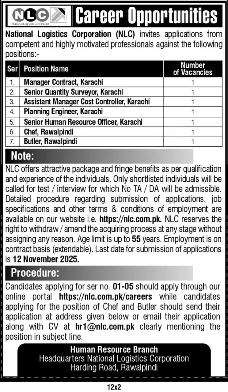 NLC jobs, National Logistics Corporation, Karachi jobs, Rawalpindi jobs, contract jobs, government jobs Pakistan, career opportunities, Manager Contract, Senior Quantity Surveyor, Assistant Manager Cost Controller, Planning Engineer, Senior HR Officer, Chef vacancy, Butler vacancy, professional careers, job openings, apply online, submit CV, HR recruitment, logistics careers, project management, construction management, planning engineer jobs, human resources jobs, culinary jobs, hospitality careers, administration jobs, contract employment, career growth, attractive salary, fringe benefits, career development, job alert, government careers, skilled professionals, motivated candidates, test and interview, no TA/DA, application procedure, last date 12 November, career portal, online application, email application, resume submission, professional growth, experienced professionals, job vacancies, career opportunities 2025, employment opportunities, age limit 55, job posting Pakistan, recruitment notice, NLC hiring, professional positions, career advancement, dynamic work environment, qualified candidates, employment notice, career opening, government sector jobs, high-paying jobs, skilled workforce, employment update.