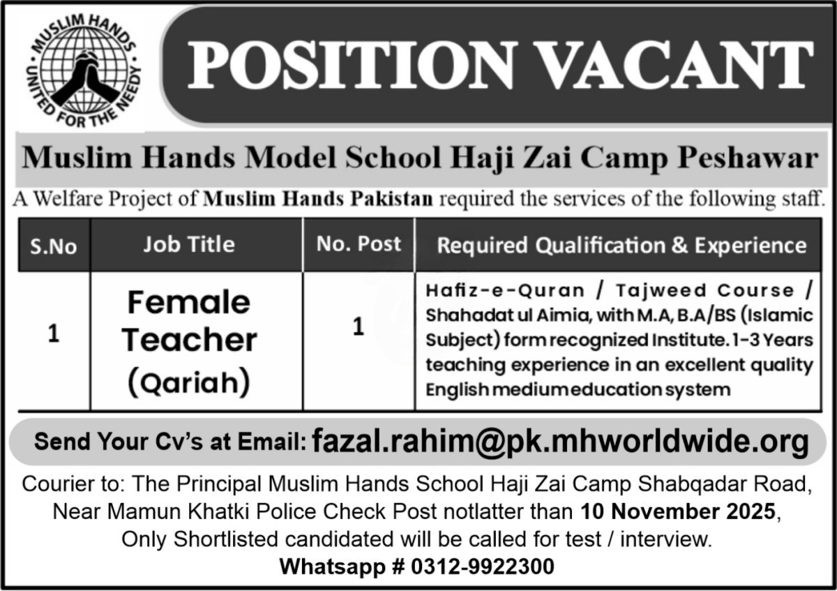 Female Teacher, Qariah, Hafiz-e-Quran, Tajweed, Shahadat ul Aimia, Islamic Studies, MA Islamic Studies, BA Islamic Studies, BS Islamic Studies, Teaching Job, Education Jobs, English Medium School, Peshawar Jobs, Haji Zai Camp, School Vacancy, Teacher Recruitment, Quran Teacher, Islamic Teacher, Female Educator, Teaching Experience, 1-3 Years Experience, Curriculum Development, Student Guidance, Classroom Management, Moral Education, Religious Education, Academic Excellence, School Staff, Teacher Hiring, Education Career, Job Opportunity, Professional Teacher, School Jobs Pakistan, Muslim Hands Pakistan, Welfare Project, Community School, Educator Role, Teaching Position, Female Staff Required, School Employment, Student Development, Quranic Teaching, Islamic Knowledge, Job Application, CV Submission, Interview Call, Test Requirement, Educational Institution, Teacher Responsibilities, Career in Education, Local Jobs Peshawar, Teaching Profession.