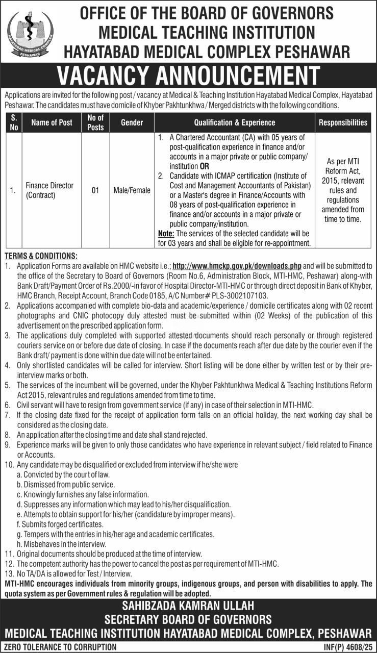 Finance Director, MTI HMC Peshawar jobs, Chartered Accountant, ICMAP, Finance Manager jobs, Accounts Officer, Medical Teaching Institution Peshawar, government finance jobs KPK, HMC Peshawar vacancies, hospital finance director, MTI Reform Act 2015, financial management jobs, budgeting, auditing, accounts management, hospital finance career, Peshawar government jobs, finance officer, Khyber Pakhtunkhwa vacancies, accountant jobs, financial leadership, cost management, job in Peshawar, finance administration, government sector job, MTI board of governors, accountant recruitment, hospital management, KPK government job, contract finance post, 2025 jobs, professional accountant, treasury management, HMC job form, HMC website, job opportunities KPK, reappointment contract, minority job quota, disabled person quota, women in finance, MTI career, hospital management jobs, experienced accountant, finance reform act, CA job, ICMA job, master in finance job, financial planning, auditing compliance, financial controller, finance lead, executive finance, institutional finance, HMC board, Peshawar careers, apply online HMC, medical teaching institute vacancy, Pakistan finance jobs, KPK job alert, 2025 MTI vacancies.