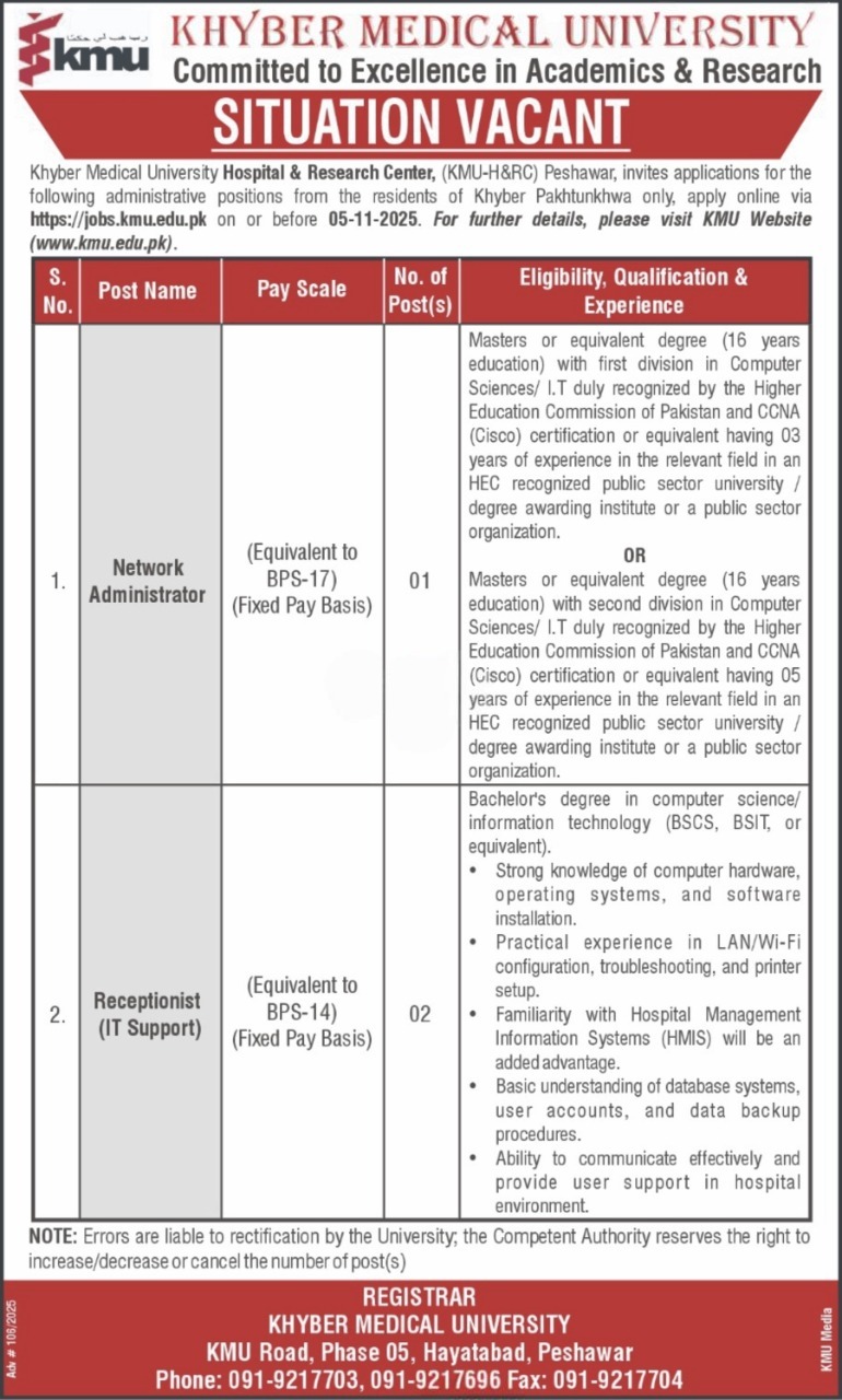 KMU jobs 2025, Khyber Medical University Peshawar jobs, Network Administrator jobs, IT Support jobs, Receptionist IT jobs, KMU Hospital jobs, KMU-H&RC Peshawar, latest government jobs in KPK, computer science jobs in universities, CCNA certified jobs, IT vacancies in Peshawar, KMU careers, Pakistan university jobs, fixed pay positions, online apply KMU, hospital IT jobs, KMU job portal, jobs.kmu.edu.pk, KMU recruitment, academic institution jobs, KMU IT department, LAN configuration jobs, Wi-Fi troubleshooting jobs, software installation support, computer hardware jobs, HMIS support, public sector IT jobs, HEC recognized university jobs, KMU network positions, Khyber Pakhtunkhwa IT jobs, Peshawar career opportunities, fixed salary positions, KMU registrar office, higher education jobs, IT admin positions, network engineer jobs Pakistan, jobs for BSCS graduates, jobs for IT professionals in Peshawar, data backup jobs, university support staff, administrative jobs in medical university, job openings 2025, KPK jobs online apply, KMU official website, computer technician jobs, latest KMU hiring, job deadline November 2025, apply online Peshawar jobs, government sector jobs, hospital research center jobs, technology support staff, university admin careers, computer maintenance jobs, network operations KMU, CCNA IT positions, Pakistan education sector jobs, KMU Peshawar vacancies, government university careers.