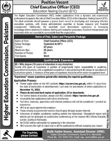 HEC Jobs 2025, Higher Education Commission Pakistan, CEO ETC, Education Testing Council, Islamabad Jobs, MP-1 Scale Jobs, Public Sector Careers, Senior Management Pakistan, Evaluation Systems, Technology-Based Testing, Leadership Role HEC, CEO Position 2025, Pakistan Education Jobs, Government Executive Jobs, HEC Career Portal, Testing and Assessment Leadership, HEC Islamabad Opportunities, Apply Online HEC, Experienced Professional Jobs, CEO Vacancy Pakistan.