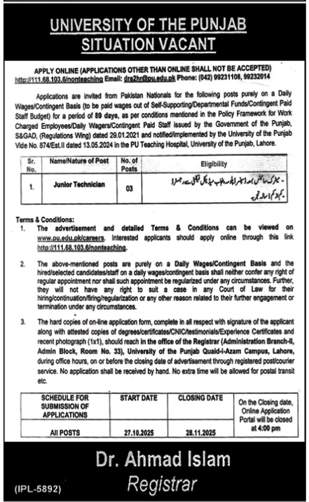 University of the Punjab Lahore, PU Teaching Hospital, Junior Technician Jobs, Daily Wages Jobs, Contingent Paid Staff, Medical Technician, Punjab University Careers, Matric Science Jobs, Medical Faculty Registration, Healthcare Technician, Short Term Contract, Government of Punjab Policy, 89 Days Appointment, Online Application PU, dra2hr@pu.edu.pk, University of the Punjab Vacancies, Non-Teaching Positions, Job Opportunities 2025, Lahore Medical Jobs, Temporary Employment Applications are invited from Pakistani nationals for the following positions at PU Teaching Hospital, University of the Punjab, Lahore. These appointments are purely on a daily wages/contingent basis for 89 days, as per the Government of Punjab’s policy for work-charged and contingent staff.