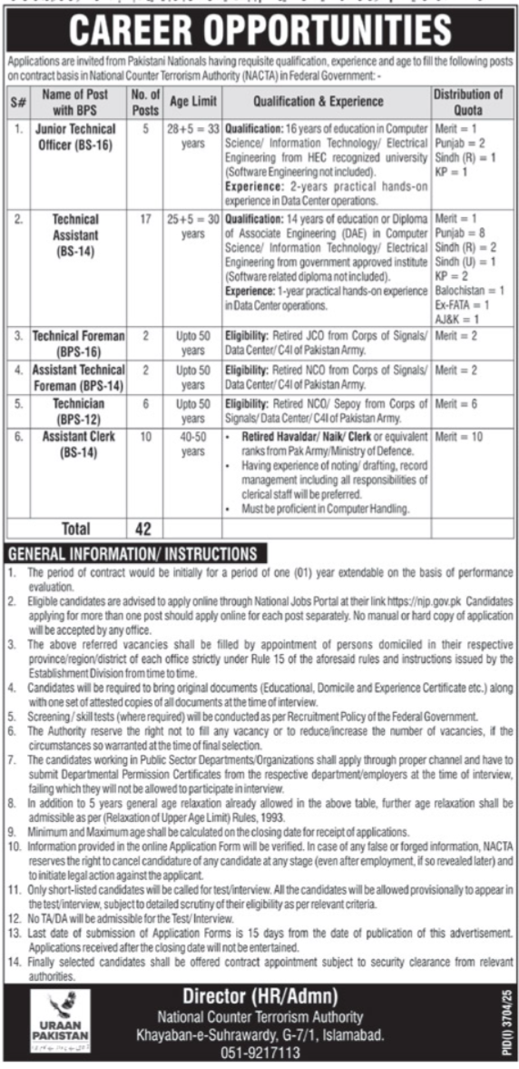 NACTA Jobs 2025, National Counter Terrorism Authority, Federal Government Jobs, Islamabad Jobs, Technical Officer Jobs, Junior Technical Officer, Technical Assistant, Data Center Jobs, IT Jobs Pakistan, Electrical Engineering Jobs, Computer Science Jobs, DAE Jobs, Retired Army Jobs, Pakistan Army Signals, Government Contract Jobs, Ministry of Interior, Public Sector Jobs, Online Apply NJP, National Jobs Portal, Security Clearance Jobs, Clerical Jobs, Assistant Clerk, Technical Foreman, Technician Vacancies, HR and Admin Jobs, Latest Islamabad Careers, Performance-based Contract, Government Recruitment 2025.