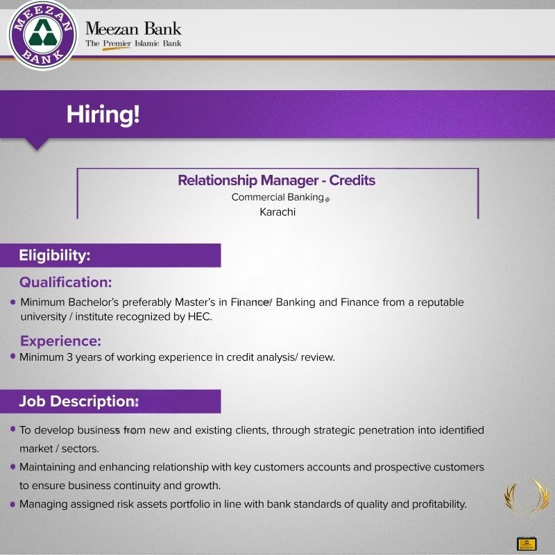 Meezan Bank, Relationship Manager, Credits, Commercial Banking, Karachi jobs, Islamic Bank, Credit Analysis, Credit Review, Client Relationship, Business Development, Risk Asset Management, Banking Careers, Finance Jobs, HEC Recognized Degree, Portfolio Management, Key Accounts, Customer Growth, Strategic Market Penetration, Banking Professional, Credit Portfolio, Loan Management, Financial Services, Corporate Banking, Banking Opportunities, Banking Professionals, Credit Risk, Banking Strategy, Business Expansion, Client Retention, Credit Management, Banking Sector Jobs, Finance Expertise, Banking Standards, Profitability Management, Relationship Management, Banking Growth, Credit Officer, Banking Experience, Finance Careers, Commercial Loans, Banking Leadership, Banking Excellence, Client Engagement, Islamic Banking Careers, Credit Portfolio Oversight, Banking Talent, Financial Management, Credit Strategy, Banking Recruitment, Career in Finance, Meezan Careers, Banking Roles, Risk Management, Banking Industry, Professional Banker, Finance Specialist, Credit Solutions.