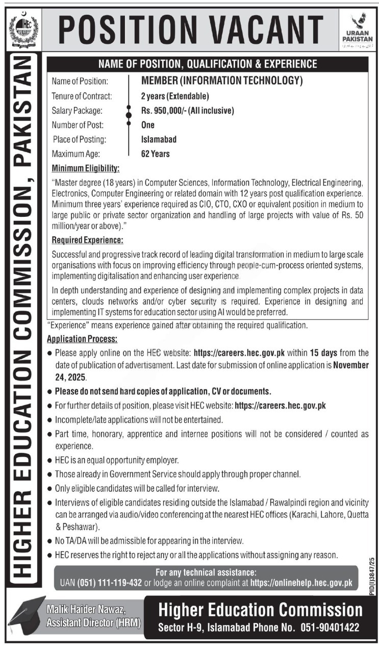 Member IT, Chief Information Officer, CIO, CTO, CXO, IT leadership, Digital Transformation, IT Strategy, Technology Management, Data Center, Cloud Computing, Cybersecurity, AI in Education, IT Systems, Education Technology, Large-scale Projects, Project Management, Budget Management, Rs. 50 Million Projects, Public Sector IT, Private Sector IT, Digitalization, Process Optimization, User Experience, IT Governance, IT Operations, Enterprise IT, IT Infrastructure, IT Security, Networking, Systems Implementation, IT Innovation, Technology Leadership, Tech Projects, IT Planning, IT Policy, IT Compliance, Digital Services, Smart Solutions, IT Architecture, Emerging Technologies, Cloud Networks, IT Management, Senior IT Role, Executive IT Position, High-level IT Experience, IT Project Delivery, IT Modernization, Digital Strategy, Tech Leadership, HEC Career, Islamabad Jobs, Senior Management, IT Expertise.