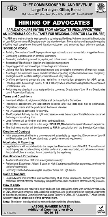 FBR is hiring experienced advocates as Legal Advisors for its Large Taxpayers Office in Karachi.