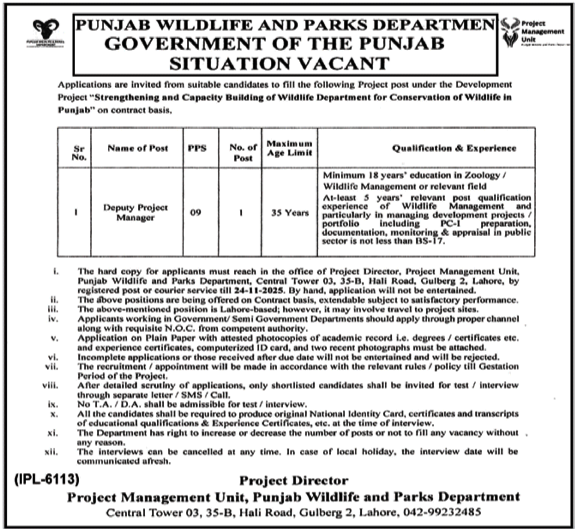 Punjab Wildlife and Parks Department, Government of Punjab, Deputy Project Manager, PPS-09, Wildlife Conservation, Zoology, Wildlife Management, Development Project, Capacity Building, Project Management Unit, Lahore Jobs, Government Jobs 2025, Contract Basis, Public Sector Jobs, PC-1 Preparation, Project Documentation, Monitoring and Appraisal, Experience Required, Wildlife Projects, Apply by Courier, 24 November 2025 Deadline, No TA/DA, Shortlisted Candidates, NOC Required, Project Director, Hali Road Lahore, Job Advertisement Punjab, Strengthening Wildlife Department.