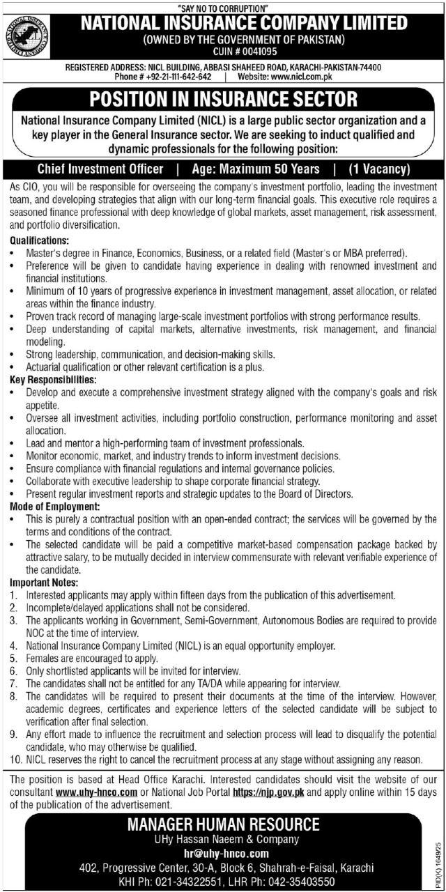 National Insurance Company Limited, NICL, Government of Pakistan, Chief Investment Officer, CIO, Investment Management, Asset Allocation, Portfolio Management, Risk Management, Capital Markets, Financial Modeling, Investment Strategy, Economic Trends, Market Analysis, Leadership, Decision Making, Contract-Based Position, Karachi, Public Sector, Equal Opportunity Employer, MBA Finance, Actuarial Certification, CFA, Investment Portfolio, Regulatory Compliance, Strategic Planning, Market-Based Salary, Online Application, National Job Portal, NJP, UHY Hassan Naeem & Company, Recruitment, Experienced Professionals, Career Opportunity.