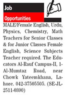 Teaching Jobs Lahore, Senior Class Teachers, Junior Class Teachers, English Teacher, Urdu Teacher, Physics Teacher, Chemistry Teacher, Math Teacher, Science Teacher, Female Teacher Jobs, Male/Female Teaching Positions, The Educators Al-Rauf Campus-II, School Jobs Lahore, Academic Careers, Teacher Recruitment 2025