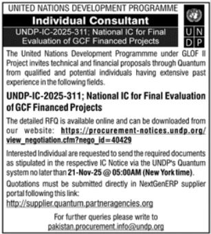 | United Nations Development Programme (UNDP) | Individual Consultant | UNDP-IC-2025-311 | GLOF II Project – Final Evaluation of GCF Financed Projects | 21-Nov-2025, 05:00 AM (New York time) | http://supplier.quantum.partneragencies.org |