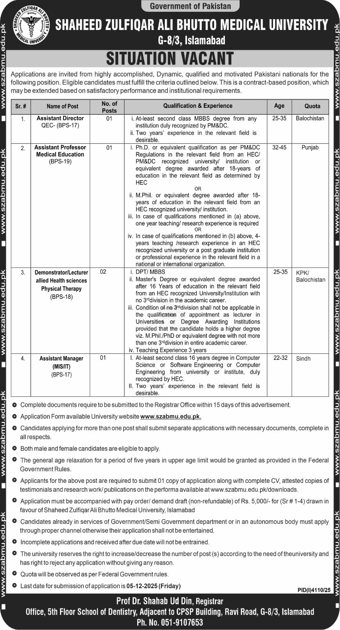Shaheed Zulfiqar Ali Bhutto Medical University, Islamabad, contract-based positions, Assistant Director QEC, Assistant Professor Medical Education, Demonstrator/Lecturer Physical Therapy, Assistant Manager MIS/IT, PM&DC, HEC regulations, eligibility criteria, age limits, federal quotas, CV, testimonials, research publications, application fee, government service, proper channel, Registrar Office, 5th December 2025, www.szabmu.edu.pk.
