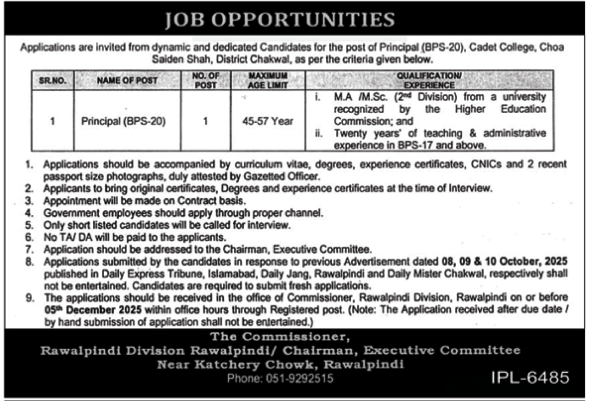 Principal jobs, BPS-20 vacancies, Cadet College recruitment, Teaching and Administrative Jobs, Rawalpindi Division jobs, Contract basis position, Experienced Educators, HEC recognized degree, Senior Teaching Positions, 20 years experience required, Government jobs Pakistan, Leadership roles in education, Apply by 05 December 2025, Administrative leadership, Education management careers, Chakwal jobs 2025, Senior Principal vacancy