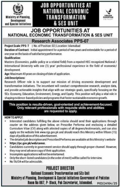 Research Associate, PPS-07, Islamabad, National Economic Transformation, 5Es Unit, Ministry of Planning, Development & Special Initiatives, Economic Research, Public Policy, Development Research, 5Es (Economy, Education, Environment, Energy, Equity), Contract Job, Master’s Degree, HEC Recognized University, Evidence-Based Policy, Sustainable Growth, Professional Experience, Shortlisting, Government Job, Application Deadline, NJP Portal.