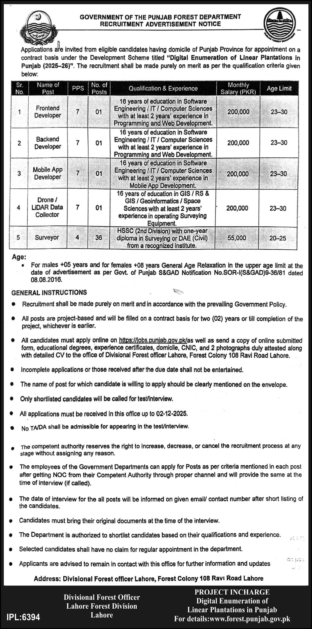 • Apply online at jobs.punjab.gov.pk and also send the printed online form with degrees, experience certificates, domicile, CNIC, two photos and CV to Divisional Forest Officer Lahore, Forest Colony 108 Ravi Road Lahore.