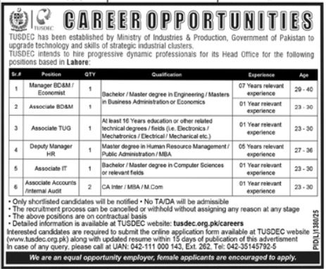 TUSDEC Jobs 2025, Government of Pakistan Careers, Lahore Job Vacancies, Contractual Positions Pakistan, Manager BDSM/Economist Jobs, Deputy Manager HR Careers, IT and Accounts Jobs, Engineering and Technical Jobs, CA Inter, MBA, M.Com Careers, Strategic Industrial Development Jobs, Ministry of Industries & Production Jobs, Online Job Application Pakistan, Equal Opportunity Employer Pakistan, Professional Careers in Lahore, Associate BOAM Jobs, Associate TUG Jobs