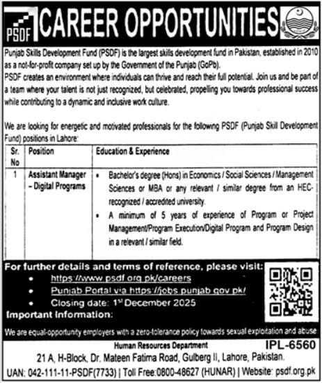 Assistant Manager, Digital Programs, Program Management, Project Management, Program Execution, Program Design, Skills Development, PSDF Careers, Lahore Jobs, Government of Punjab, Professional Growth, Inclusive Work Culture, Equal Opportunity Employer, HEC-Recognized Degree, MBA, Social Sciences, Economics, Management Sciences, Digital Program Management, Career Opportunity, Program Implementation