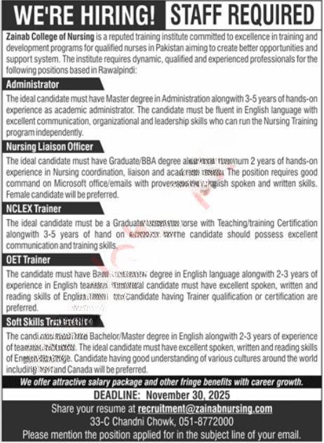 Zainab College of Nursing, Rawalpindi jobs, nursing training, nursing administration, academic administrator, nursing liaison officer, NCLEX trainer, OET trainer, soft skills trainer, nursing coordination, teaching certification, English trainer, leadership skills, organizational skills, communication skills, career growth, professional development, attractive salary, female preferred, Microsoft Office, training programs, recruitment, healthcare education, nursing careers, international culture knowledge.