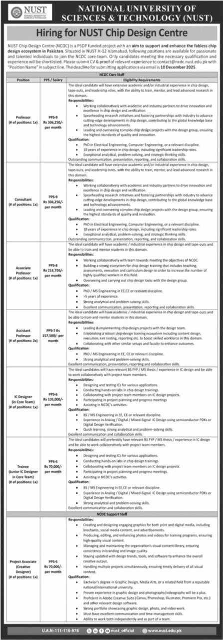 National University of Sciences and Technology is hiring for its Chip Design Centre in Islamabad. The centre supports the chip design ecosystem in Pakistan. The university is looking for qualified people who can join the core team and contribute to research, design work, teaching, and industry collaboration. Candidates must meet the required education and experience for each role. The deadline for applications is 10 December 2025.