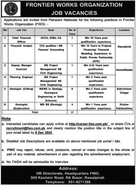 Frontier Works Organization, FWO Careers, Pakistani Nationals, Job Vacancies 2025, Chief Financial Officer, Financial Analyst, Deputy Manager Contract, Planning Engineer, Geologist Drilling, Geologist Exploration, Project Management, Civil Engineering Jobs, Geology Jobs, ACCA, ICMA, CA, CFA, MS Finance Accounting, Post-Qualification Experience, Public Private Partnership, PPP, Apply Online FWO, recruitment@fwo.com.pk, Rawalpindi, Karachi, Quetta, Chagai, Khyber Pakhtunkhwa, Contract Jobs, Deadline 8 December 2025