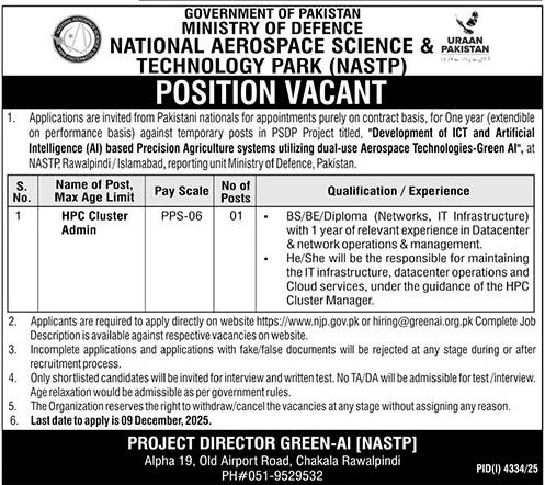 HPC Cluster Administrator, IT Infrastructure, Datacenter Operations, Network Management, Cloud Services, BS/BE Networks, IT Diploma, Precision Agriculture, Artificial Intelligence, AI Systems, Aerospace Technology, NASTP Rawalpindi, Contract Job, Pakistani Nationals, Government of Pakistan, Ministry of Defence, PSDP Project, Green AI, IT Operations, HPC Cluster, Network Administration, One-Year Contract, Extendable, Job Opportunity, Application Deadline 09 December 2025.