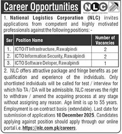 National Logistics Corporation, NLC careers, ICT Officer jobs, IT Infrastructure, Information Security, Software Developer, Rawalpindi jobs, contract jobs, Pakistani professionals, online application, career opportunities, government jobs, extendable contract, job vacancies 2025, test/interview, no TA/DA, apply online, age limit 55.