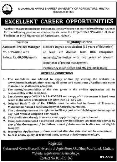 | Muhammad Nawaz Sharif University of Agriculture, Multan | Assistant Project Manager | 01 | Rs. 60,000/month | Master's Degree (16 years of education) at least 2nd division from HEC recognized university/institution | 2 years relevant experience in project management | Proficiency in MS Office and MS Project | Online through www.mnsuam.edu.pk | 11-12-2025 | 12-12-2025 | Rs. 1,500 (Bank Draft in favor of Treasurer, MNSUAM) |