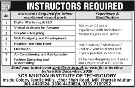 Instructors Required, Digital Marketing, SEO, Virtual Assistant, Amazon, Graphics Designing, Web Designing, Web Development, Plumber, Pipe Fitter, Electrician, Air Conditioning, Refrigeration, Fashion Designing, Dressmaking, DAE, Diploma, BS Degree, Work Experience, SOS Multan Institute of Technology, Sher Shah Road Multan, CV Submission, Job Interview, Deadline 5th December 2025, Technical Skills, IT Sector, Practical Experience.