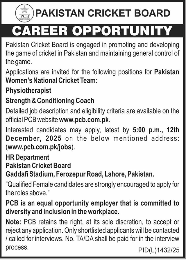 Pakistan Cricket Board, PCB Careers, Cricket Jobs Pakistan, Women’s National Cricket Team, Physiotherapist Jobs, Strength & Conditioning Coach, Sports Careers, Fitness Coach Pakistan, Apply Online PCB, Lahore Jobs, Contract Jobs PCB, Female Friendly Jobs, Sports Health Careers, Diversity & Inclusion, PCB Job Opportunities, Cricket Coaching Roles, Sports Recruitment Pakistan, Health & Fitness Careers, PCB Vacancies 2025, Professional Sports Jobs.