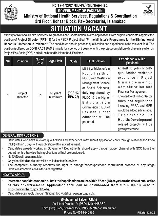 Project Director, Hepatitis C Elimination, Public Health Leadership, MBBS, Master’s in Public Health, Management Science, Social Sciences, PMDC Registered, HEC Approved, Project Management, Financial Management, Administration, Health Development Projects, Public Sector Rules, PPRA, GFR, Islamabad Jobs, Contract Position, PSDP Project, Senior Management, Healthcare Programs, Government of Pakistan, 15+ Years Experience, Health Sector Leadership, Strategic Planning, Policy Implementation, Program Monitoring, Team Management, Government Recruitment, High-Level Healthcare Projects
