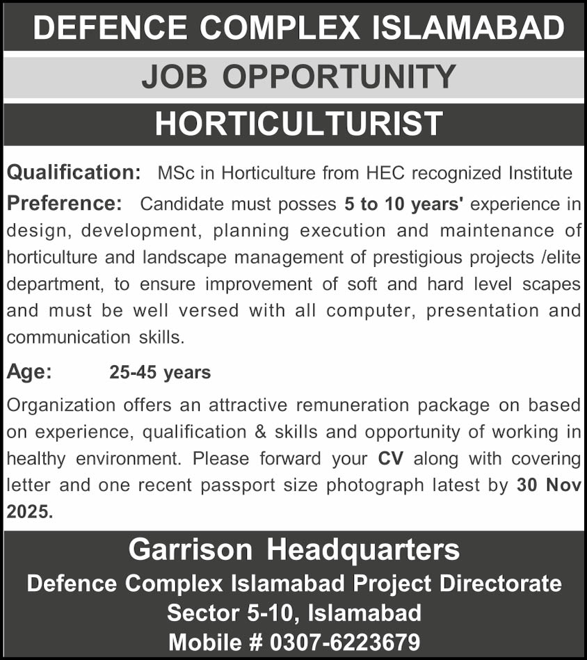 Horticulturist, Defence Complex Islamabad, MSc Horticulture, HEC recognized, landscaping, horticulture management, project planning, landscape design, execution, maintenance, soft landscaping, hard landscaping, high-profile projects, elite departments, computer skills, presentation skills, communication skills, 5-10 years experience, age 25-45, attractive remuneration, healthy work environment, Islamabad jobs, project directorate, Garrison Headquarters, career opportunity, government job, deadline 30 November 2025.
