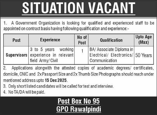 Government job Rawalpindi, contract-based recruitment, Supervisor position, Electrical, Electronics, Communication, field experience, Army experience, Civil work experience, experienced professionals, application deadline 15 Dec 2025, shortlisted candidates, test and interview, age limit 50 years, Post Box No 95 GPO Rawalpindi.