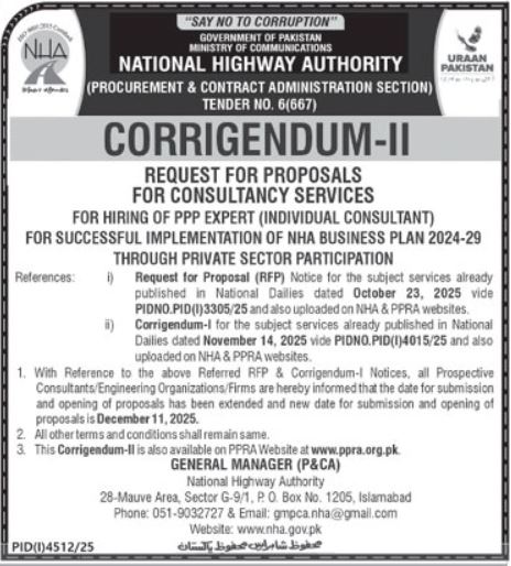 NHA, National Highway Authority, Ministry of Communications, Pakistan, PPP Expert, Individual Consultant, Consultancy, Contract, Islamabad, Submission Deadline, December 11 2025, RFP, Corrigendum-II, Business Plan 2024-29, Private Sector Participation, Proposal Submission, Proposal Opening, PID No. PID(1)3305/25, PID No. PID(1)4015/25, PPRA Website, gmpca.nha@gmail.com, Phone 051-9032727, Project Implementation, Terms and Conditions.