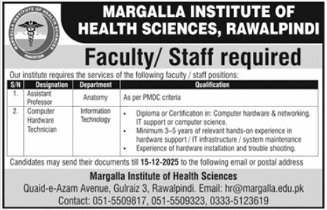 Send your CV and documents by 15-12-2025 to hr@margalla.edu.pk or postal address: