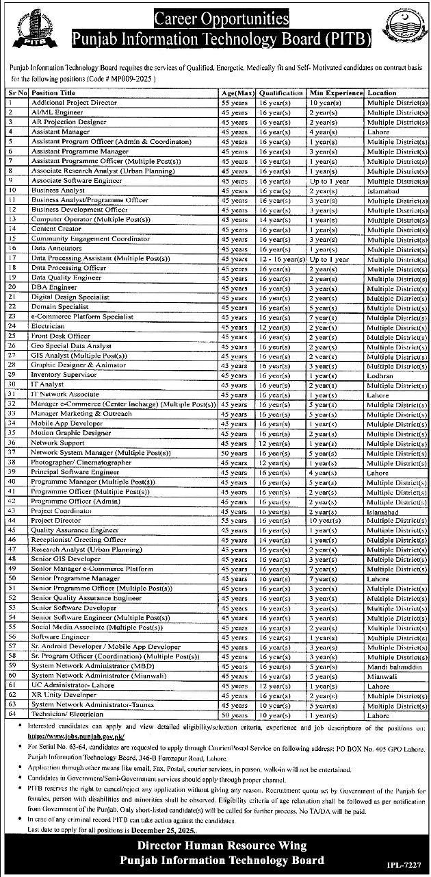 PITB jobs, Punjab IT Board careers, contract positions, IT jobs Punjab, software engineer vacancies, AI/ML engineer jobs, mobile app developer, GIS analyst careers, e-commerce specialist, project manager roles, program officer positions, data analyst jobs, network administrator, digital design specialist, front desk officer, community engagement coordinator, Lahore jobs, multiple district opportunities, government quota jobs, women-friendly jobs, minority-friendly jobs, disability quota jobs, apply by courier, December 25 deadline, PITB recruitment, career growth opportunities, IT sector careers, research analyst positions, quality assurance engineer, content creator jobs, motion graphic designer, technician/electrician, senior software developer, principal software engineer.