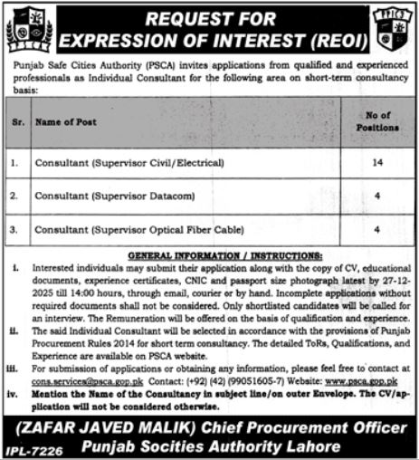 Punjab Safe Cities Authority, PSCA, Individual Consultant, short-term consultancy, Civil Supervisor, Electrical Supervisor, Datacom Supervisor, Optical Fiber Cable Supervisor, consultancy jobs, government jobs, Lahore, Pakistan, application deadline 27-12-2025, CV submission, educational documents, experience certificates, CNIC, interview, Punjab Procurement Rules 2014, professional experience, remuneration, ToRs, career opportunity, PSCA careers, technical consultant, project supervision, engineering consultancy, telecom infrastructure, data communication, fiber optic projects.