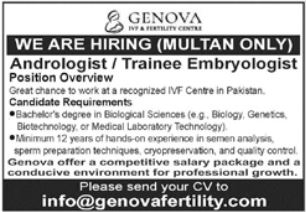 Genova Vy & Fertility Centre, Multan, Andrologist, Trainee Embryologist, IVF Centre Pakistan, Semen analysis, Sperm preparation, Cryopreservation, Quality control, Biological Sciences, Genetics, Biotechnology, Medical Laboratory Technology, Fertility lab, Assisted Reproductive Technology, Reproductive health, Professional growth, Competitive salary, Laboratory expertise, Hands-on experience.