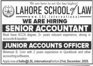 Senior Accountant, Junior Accounts Officer, ACCA, B.Com, Accounting, Taxation, QuickBooks, Accounting Software, Financial Reporting, Ledger Management, Payroll Processing, Budget Preparation, Tax Compliance, Full-Time, Lahore, Career Growth, Professional Finance, Team-Oriented, Hands-On Experience, Apply by 21st December 2025.