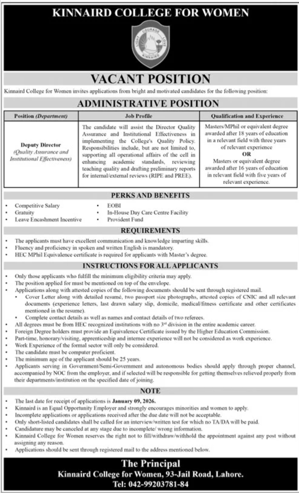 Deputy Director, Quality Assurance, Institutional Effectiveness, Academic Standards, Teaching Quality, Internal Reviews, External Reviews, RIPE, PREE, Higher Education, Lahore Jobs, Administrative Role, HEC Recognized Degrees, MPhil, Master’s Degree, Formal Sector Experience, Competitive Salary, EOBI, Provident Fund, Gratuity, Leave Encashment, Day Care Facility, English Proficiency, Communication Skills, Computer Proficient, Equal Opportunity Employer, Women Careers, Minority Friendly, Registered Mail Application, Government Employees NOC.