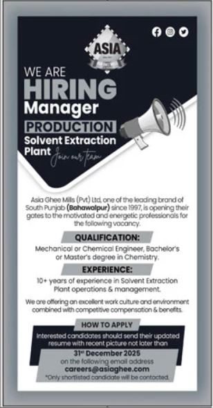 Asia Ghee Mills (Pvt) Ltd, a leading brand in South Punjab (Bahawalpur) since 1997, is looking for a motivated and experienced professional to join as Manager – Production, Solvent Extraction Plant.