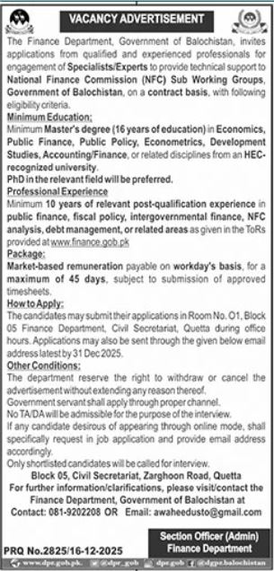 Finance Department Balochistan, Specialist, Expert, National Finance Commission, NFC, Public Finance, Fiscal Policy, Intergovernmental Finance, Debt Management, NFC Analysis, Contract, Market-based Remuneration, Master’s Degree, PhD Preferred, 10+ Years Experience, Quetta, Civil Secretariat, Technical Support, Government of Balochistan, Application Deadline 31 Dec 2025, Shortlisted Candidates, Online Interview Option