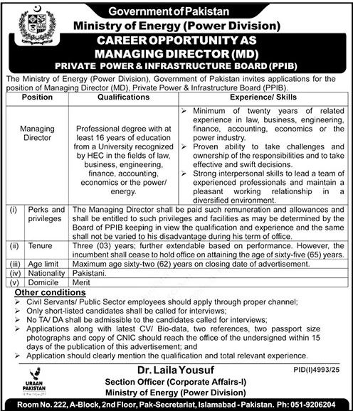 The Ministry of Energy (Power Division) invites applications for the position of Managing Director at the Private Power & Infrastructure Board (PPIB).