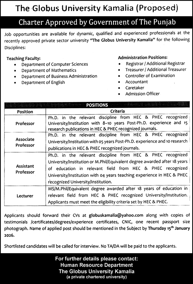 The Globus University Kamalia, private university jobs Pakistan, teaching faculty jobs, administrative jobs, Professor jobs, Associate Professor jobs, Assistant Professor jobs, Lecturer jobs, Registrar jobs, Treasurer jobs, Controller of Examination jobs, Accountant jobs, Admission Officer jobs, Pakistan university careers, HEC & PHEC recognized degrees, academic jobs Punjab, university faculty hiring.